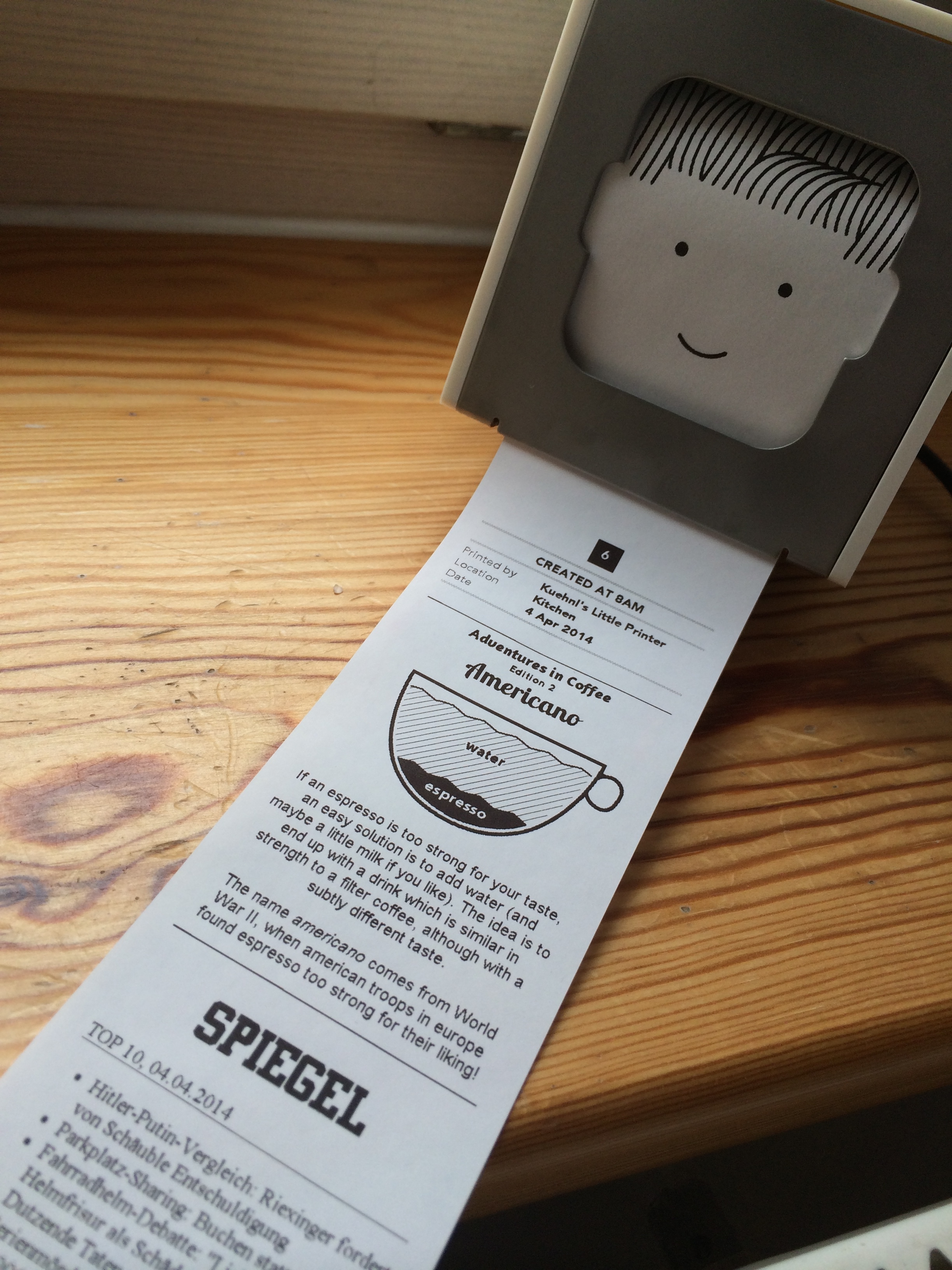 Der kleine Kumpel schob sich irgendwann Ende 2011 auf mein Radar, und schon damals dachte ich: „Naja, das braucht ja kein Mensch.“ Ein Ding, das auf Thermopapier im Kassenrollenformat Inhalte ausdruckte, die ich jederzeit auf dem Display meines iPhones nachschauen konnte. Auch als der kleine Drucker ab Sommer 2012 vorbestellt werden konnte, war klar, dass er eigentlich keinen Nutzen haben würde – und doch fand ich ihn irgendwie knuffig. Er hatte ja auch ein Gesicht, das immer aus dem Display rausguckte. Mit anderen Worten: Es war nicht einfach nur irgendein weiteres gesichtsloses Ding. Irgendwas Besonderes war schon dran. Er steckte mir halt in der Nase, der Little Printer. Es kam das Jahr 2014 – und die Frage meiner Tochter.