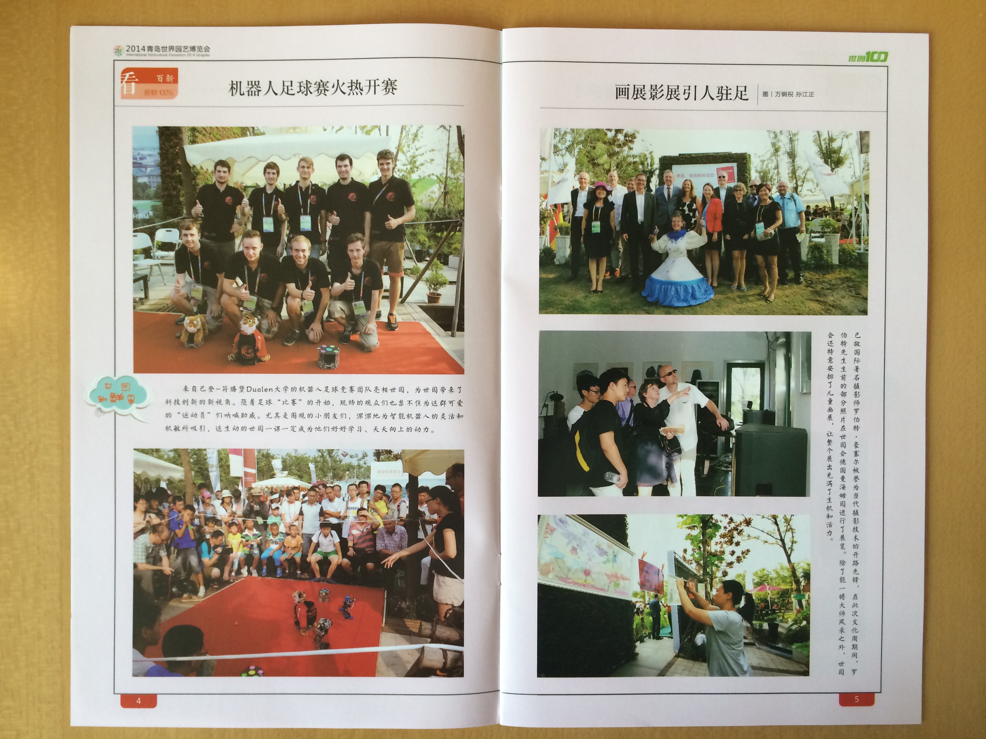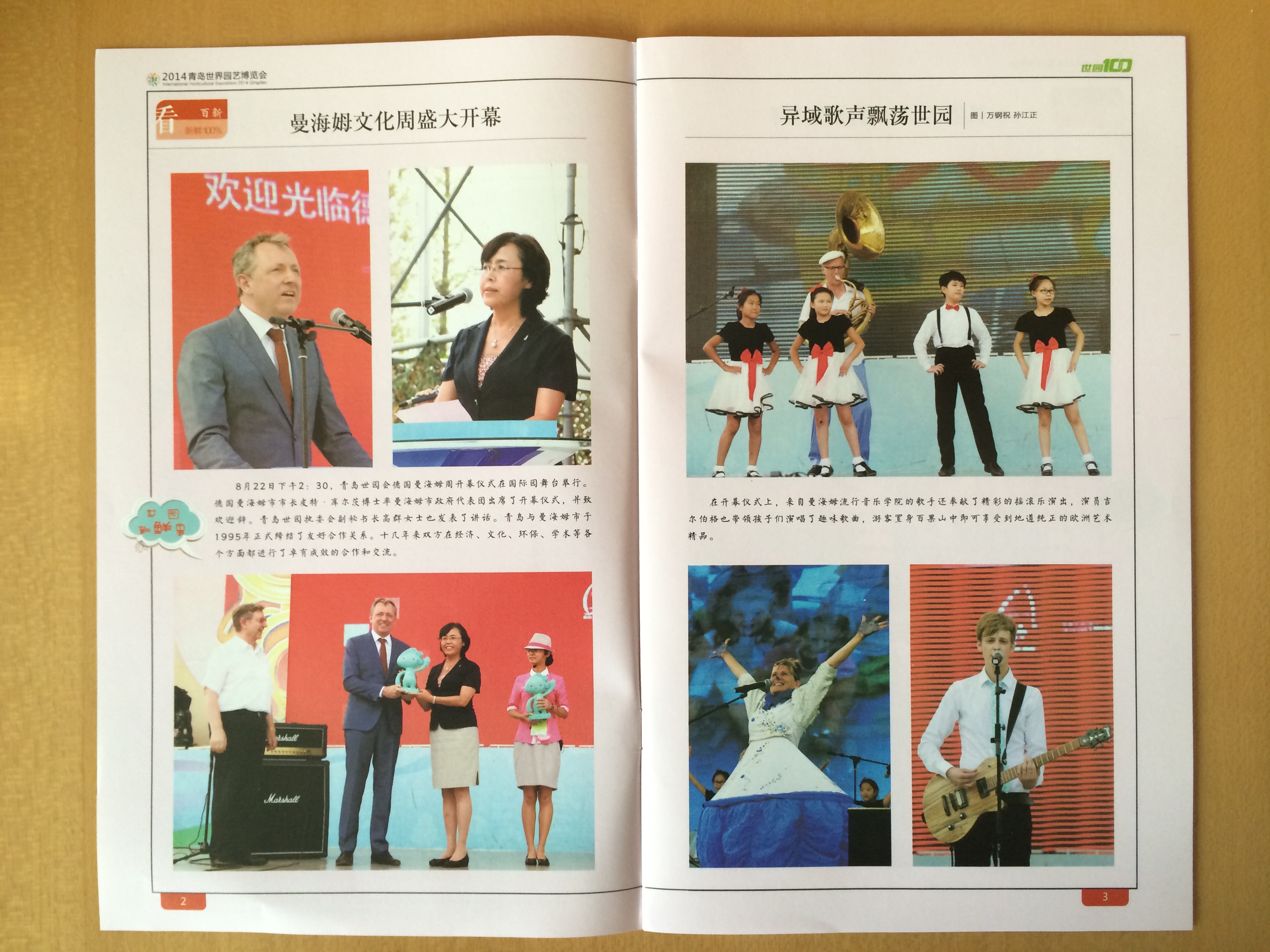 Qingdao Belegexemplar. von Ralph Kühnl 24. August 2014 Lesezeit: 11 Sekunden In der täglich erscheinenden Parkzeitung der IGA war die „Mannheim Woche“ der Aufmacher. Ich habe leider keine Ahnung, was drinsteht – aber die Bilder bilden das Programm des ersten Samstages ganz gut ab. Mehr zum Thema: Bildergalerie: Eröffnung der „Mannheim Woche“ in Qingdao RNF und Qingdao-TV – eine ungewöhnliche Freundschaft Das RNF-Qingdao-Blog [VIDEO] Die Reportage: „Lange Freundschaft. Endlich Liebe. – Mannheims Beziehungen zu Qingdao.“ [VIDEO] Studio-Talk vor der Abreise nach Qingdao Beitragsnavigation Vorheriger Beitrag Vorheriger Beitrag Nächster Beitrag Nächster Beitrag