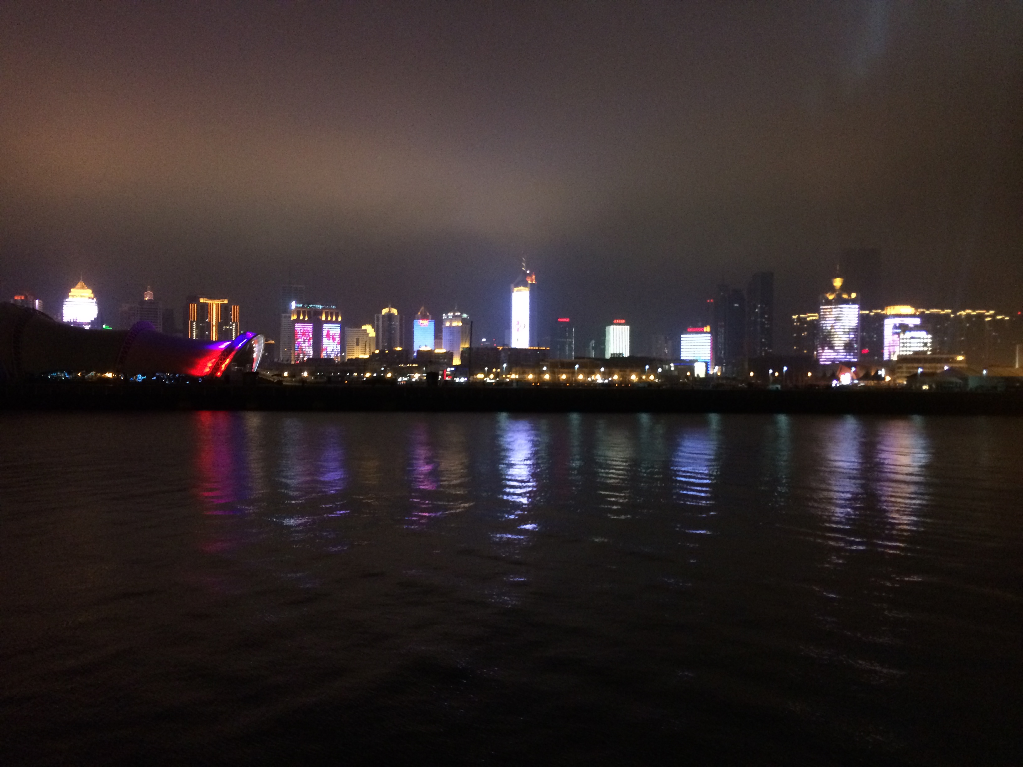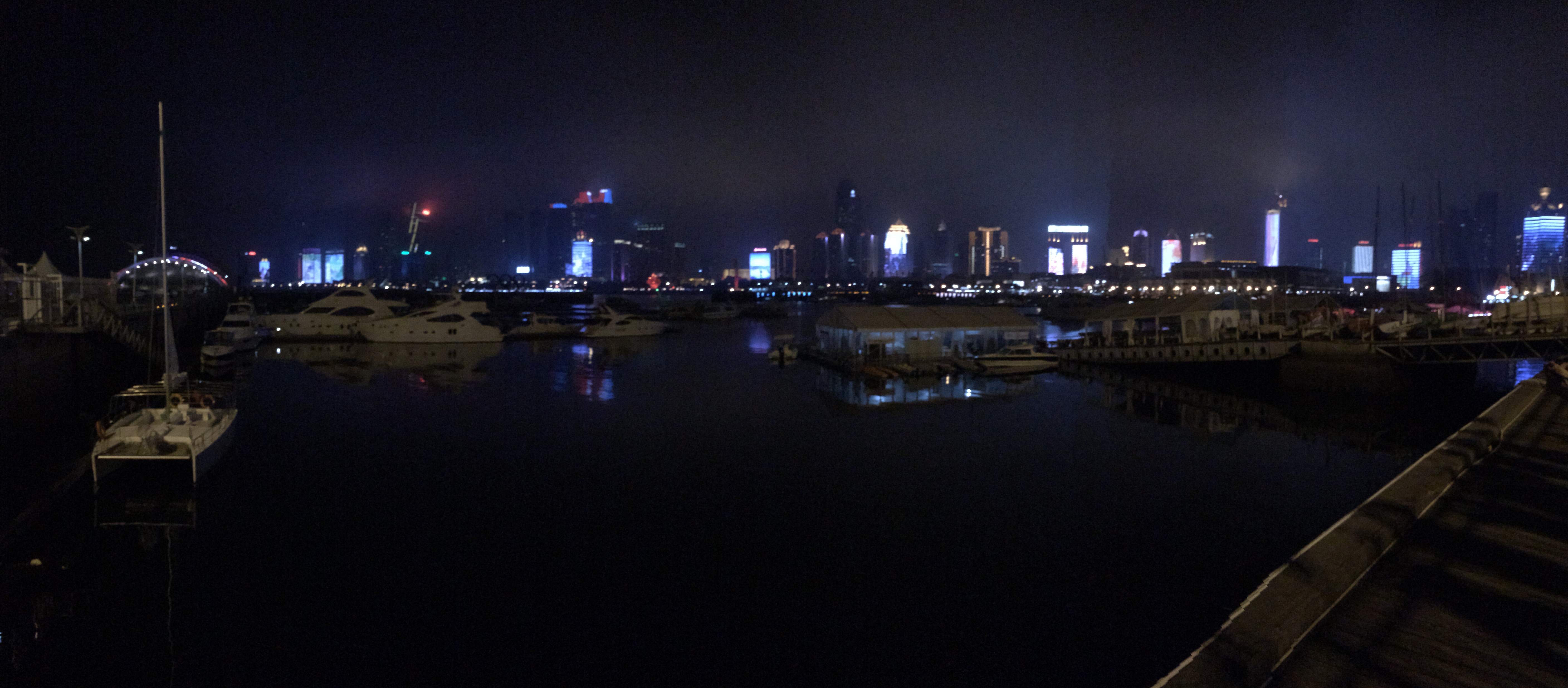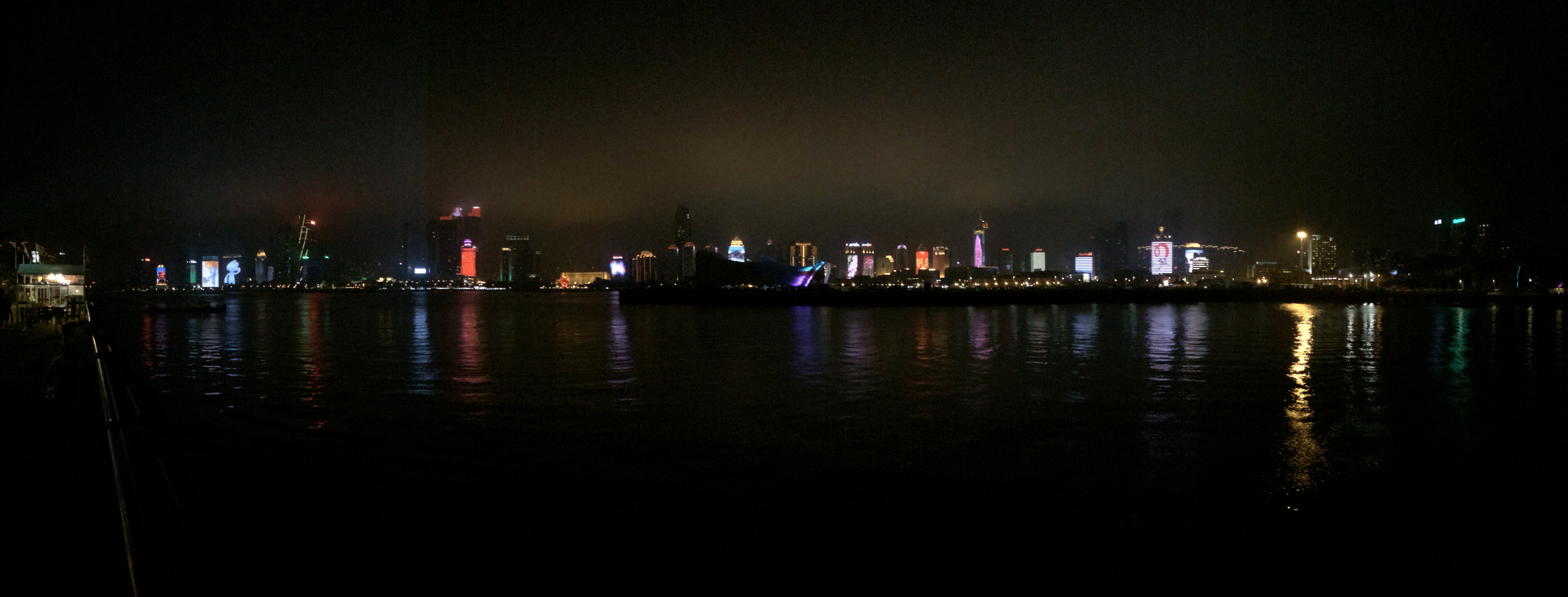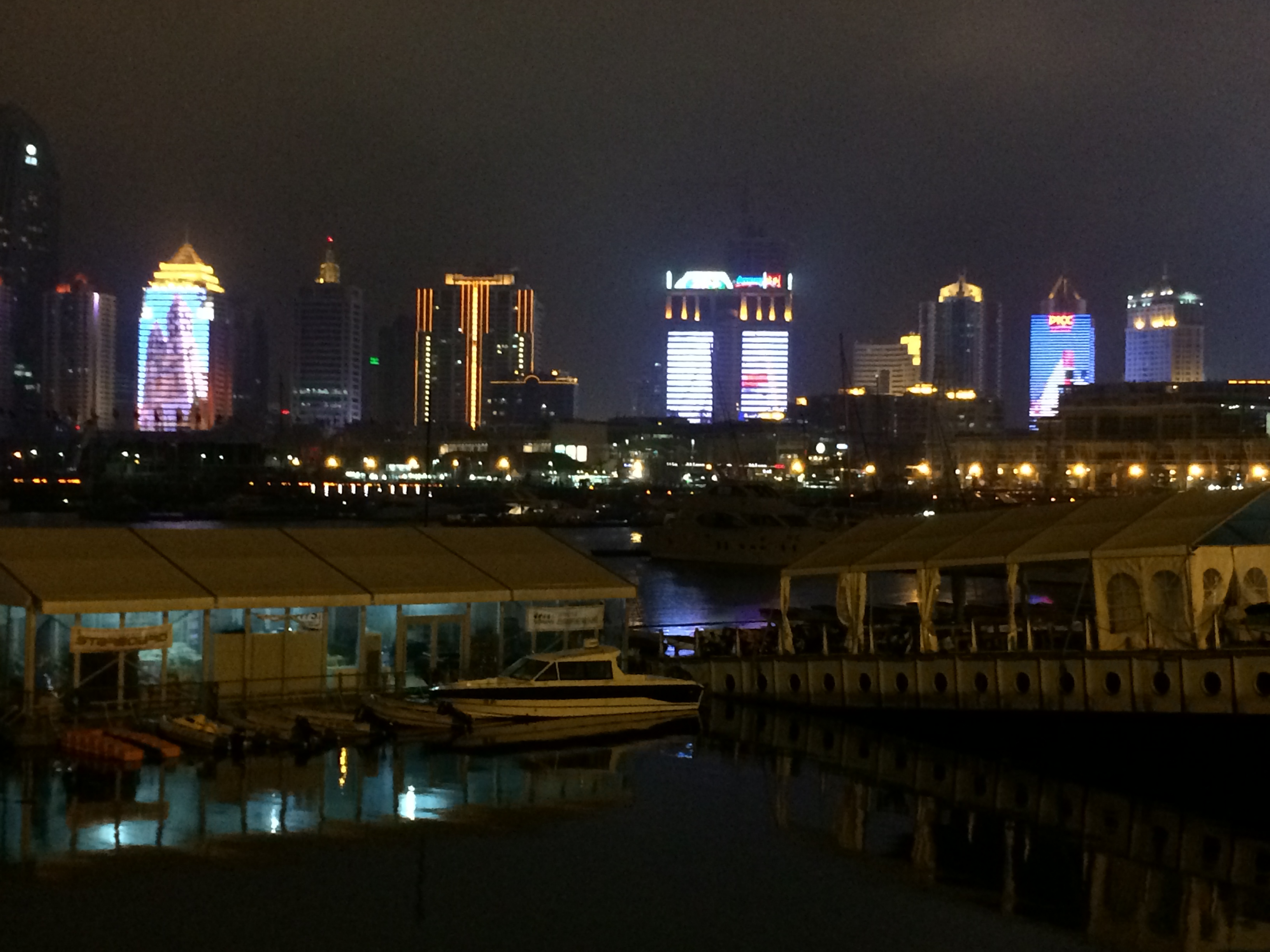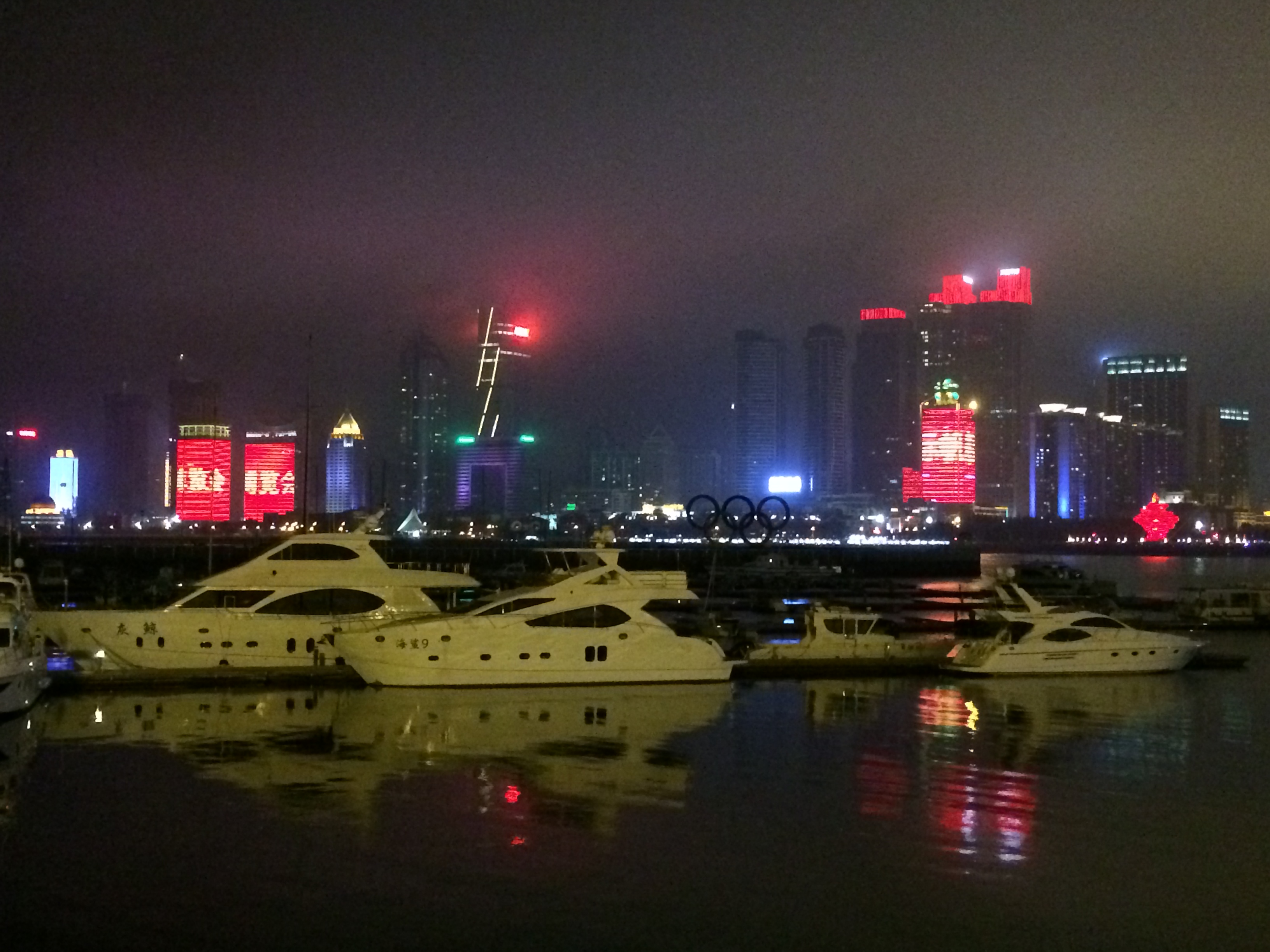 Was am Tag noch einigermaßen nüchtern nach einer Ansammlung von Hochhäusern aussieht, zeigt sich in der Nacht völlig anders. Die Fassaden der Hochhäuser erwachen gewissermaßen zum Leben – als Riesenleinwände, Monsterdisplays. Bespielt von Filmen, Werbespots, Leuchtbotschaften. Die Nachtbilder zeigen die Sicht vom Olympischen Segelzentrum in Richtung Downtown. Ein überschaubares Areal im Vergleich zur Gesamtgröße der Stadt, aber das touristische Zentrum Qingdaos, Kneipenmeile, Ausgehviertel.