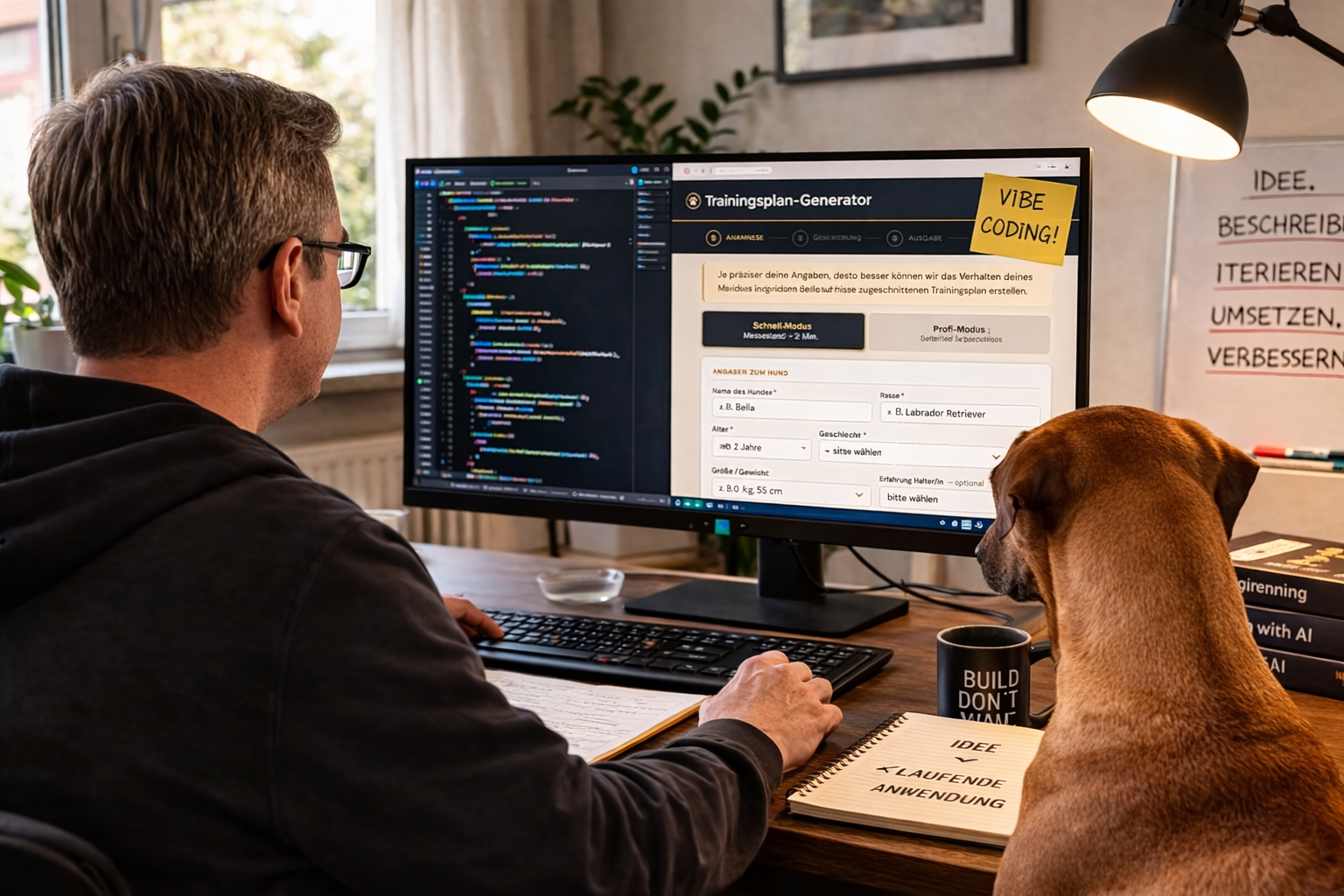 Das eine ist der Trainingsplan-Generator für meine Hundeschule PAWCADEMY. Eine webbasierte Anwendung, in der Hundehalterinnen und Hundehalter ein paar Angaben zu ihrem Hund machen — Alter, Rasse, Problem, Trainingsziel — und dann einen strukturierten, individuellen Trainingsplan erhalten. Kein statisches PDF, kein Copy-paste, sondern ein Ergebnis, das auf einer umfangreichen Wissensbasis aufbaut, den Notizen aus inzwischen mehr als zwei Jahren intensiver Ausbildung, Weiterbildung und eigener Praxis: Trainingsprotokolle, Fachliteratur, Beobachtungen aus echten Kursstunden.